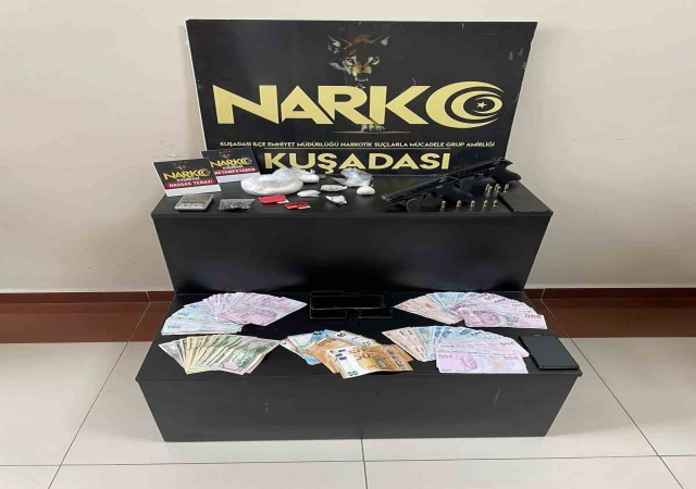 Kuşadası, Aydın ilçesinde gerçekleştirilen uyuşturucu operasyonunda, 4 şüpheli polis ekipleri tarafından yakalandı. Operasyon sonucunda çok sayıda uyuşturucu madde ve nakit para ele geçirildi. Aydın Emniyet Müdürlüğü Narkotik Suçlarla Mücadele Şube Müdürlüğü tarafından gerçekleştirilen operasyonlar, uyuşturucu madde ticaretini ve kullanımını engellemek amacıyla sürdürülüyor. Bu kapsamda bir adreste yapılan operasyonda, G.K., Ş.E., K.Ö. ve B.E. adlı şüpheliler suçüstü yakalandı. Yapılan aramada, 503.04 gram metamfetamin, 2 ruhsatsız tabanca, 11 tabanca fişi, uyuşturucu madde satışından elde edildiği düşünülen 31,550 TL, bin 350 Euro ve 347 ABD Doları bulundu. Gözaltına alınan G.K., Ş.E., K.Ö. ve B.E. isimli şüpheliler hakkında uyuşturucu madde ticareti suçlamasıyla adli işlem başlatıldı. Mahkemeye çıkarılan şüphelilerden üçü tutuklanırken, biri serbest bırakıldı.