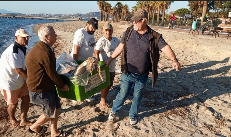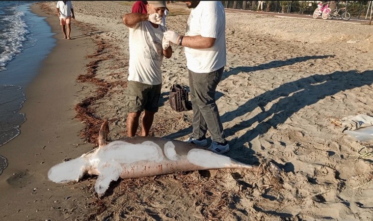 Aydın’ın Kuşadası ilçesinde hedef dışı av olarak ağlara takılıp telef olduğu düşünülen tırtak türü yunus balığı karaya vurmuş olarak bulundu.