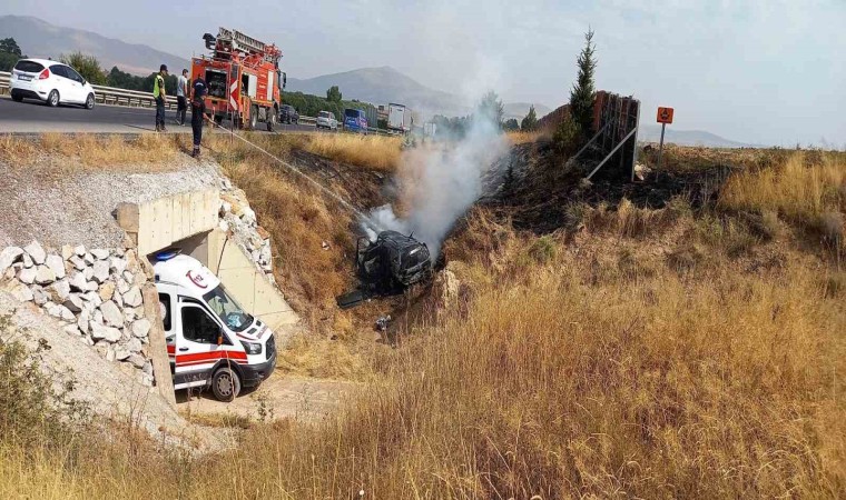 Kütahya-Afyonkarahisar yolunda sürücüsünün direksiyon hakimiyetini kaybetmesi sonucu şarampole yuvarlanan araçta yangın çıktı, 2 kişi yaralandı.