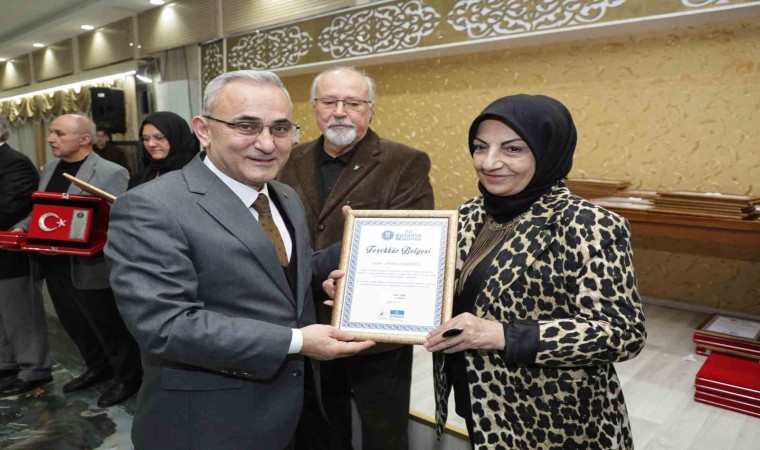 Geçtiğimiz günlerde hayatını kaybeden Kütahya Ağız ve Diş Sağlığı Hastanesi’nde görevli diş hekimi ve fotoğraf sanatçısı Binnur Gültekin’in de anıldığı etkinlikte, müzikte şehre değer katan Mustafa Salün, Zeynel Sağ, Mesut Tezcan, Metin Kıymık, Nilüfer Örnek Özkan, Kudret Karayiğit ve Tekin Uğurel, resimde Adil Özkan, Bayram Yıldız, Hidayet Şen, Gönül Güven, Halil Kırkıl, Sabri Tezcan, Sebahat Sarıoğlu, Haşim Can, Süleyman Dönmez, Fatma Yayla, Hüseyin Efe ve Zafer Erzincan, halk oyunlarında Kerim Vural, Erdoğan Sevim, Zafer Baysal, Ramazan Yıldırım, Ömer Erdönmez, İsmail Uyalçak ve Mustafa Yazgan, şiirde Esat Anık ve İsa Kahraman, çinide Mehmet Gürsoy, Hamza Üstünkaya, Mehmet Koçer, Mustafa Dumanlar, İsmail Yiğit, İbrahim Kocaoğlu ve Saim Kolhan, keçe sanatında Fatma Vural, edebiyatta Ali Günhan ve Kadir Güler, hat sanatında Ahmet Türk ve Mustafa Er, heykelde Mustafa Kemal Altınsoy, Nuri Fuat Öziğdeci ve Ömer Cesur, sigrafittoda Metin Tunca, minyatürde Teyfik Solmaz, rölyefde Abdurrahman Yıldız, ahşapta Eyüp İşal ve fotoğrafta Ahmet Gökyiğit, Hüseyin Feyzi Kılıç ile geçtiğimiz günlerde vefat eden diş hekimi ve fotoğraf sanatçısı Binnur Gültekin adına Gültekin Ailesi teşekkür belgelerini ve plaketlerini, Kütahya Hava Er Eğitim Tugay Komutanı Hava Tuğgeneral Mustafa Baş, Belediye Başkanı Prof. Dr. Alim Işık ve protokol üyelerinden aldı.