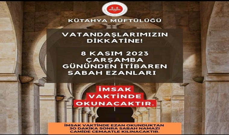 Kütahya İl Müftüsü İrfan Açık yaptığı açıklamada, ”8 Kasım 2023 Çarşamba itibarıyla sabah ezanları ilimiz genelinde imsak vaktinin başlamasıyla okunacak, sabah namazları ise camilerimizde imsak vaktinden yarım saat sonra eda edilecektir” ifadelerine yer verdi.