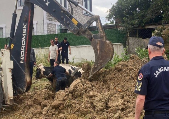 Kuyuya düşen büyükbaş, kepçeyle kurtarıldı