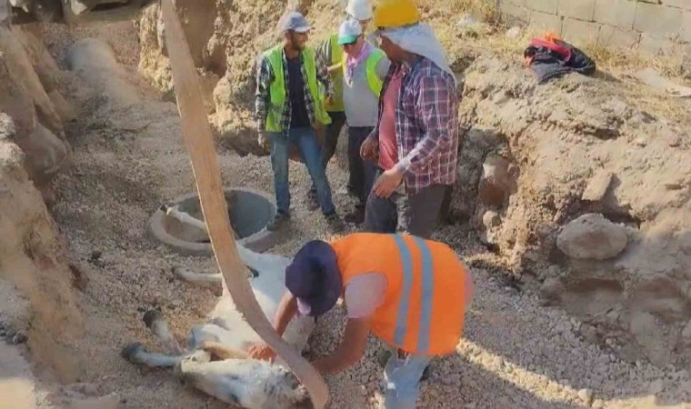 Hatay’ın Hassa ilçesi Aktepe Mahallesi’nde ekiplerin yürüttüğü alt yapı çalışmaları esnasında bir eşek bölgedeki kuyuya düştü. Ekipler, vatandaşların yardım istemesi üzerine iş makinasıyla kurtarma operasyonu başlattı. Yaklaşık 20 dakika süren zorlu operasyon ile eşek düştüğü kuyudan çıkartılarak sahibine teslim edildi.