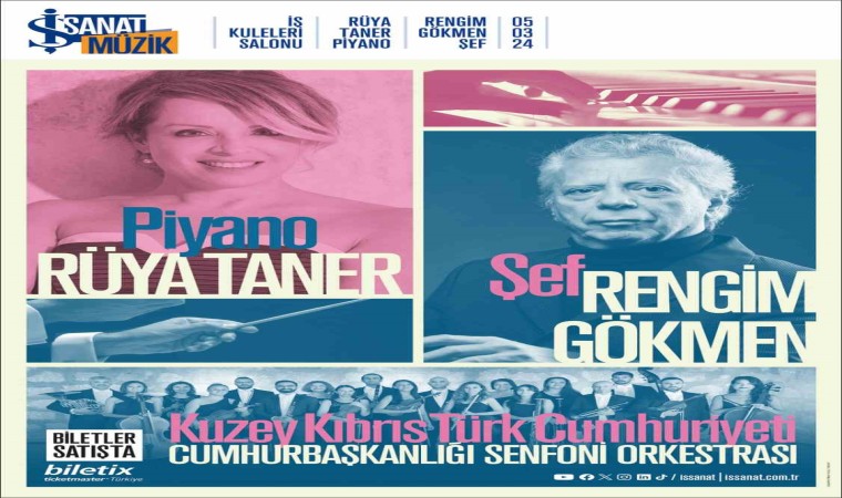 İş Sanat 5 Mart Salı akşamı Kuzey Kıbrıs Türk Cumhuriyeti Cumhurbaşkanlığı Senfoni Orkestrası’nı sahnesinde ağırlıyor. Kıbrıs Barış Harekâtı’nın 50’nci yılında gerçekleşecek konserde ünlü piyanist Rüya Taner solist olarak yer alacak. Orkestra şefi Rengim Gökmen yönetimindeki konserin repertuvarında Ali Hoca’nın Kıbrıs Kapriçyosu ile Wolfgang Amadeus Mozart ve Felix Mendelssoh’un eserleri yer alıyor.