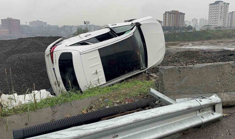 Kuzey Marmara Otoyolu’nda sürücüsünün kontrolünden çıkan otomobil otoyol kenarındaki şantiye alanına uçtu. Çakıl taşlarının üzerine yan yatan otomobilden sürücü yara alamadan kurtuldu.