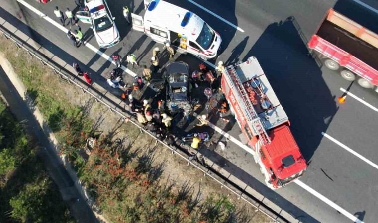 Kuzey Marmara Otoyolu Eyüpsultan Odayeri mevkiinde süratli gittiği iddia edilen bir cip önce otomobile ardından da tıra arkadan çarptı. Kazanın ardından cipin içerisinde sıkışan 4 kadın, itfaiye ekipleri tarafından kurtarıldı. Toplamda 6 kişinin yaralandığı feci kazada 2 kişinin ağır yaralandığı öğrenildi. Sağlık ekiplerinin bir kadına ise 10 dakika boyunca kalp masajı yaptığı görüldü.
