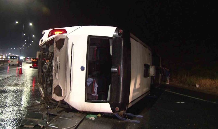 Kuzey Marmara Otoyolu’nda sürücüsünün direksiyon hakimiyetini kaybettiği otobüs devrildi. Otobüste hiçbir yolcunun olmaması ise faciayı önledi.