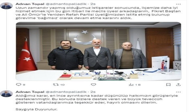 Konuyla ilgili açıklama yapan Adnan Topal, "Saygıdeğer kıymetli hemşehrilerim. Uzun zamandır vatandaşlarımız, sivil toplum kuruluşları ve topluluklarımızla yapmış olduğumuz istişareler sonucunda, siz kıymetli hemşehrilerimizin kutsal emanetini taşıyıp, ilçemize daha iyi hizmet etmek için bu gün itibarıyla meclis üyesi arkadaşlarım, Başkan Yardımcım Fikret Baştan ve Ali Ömür’le Yeniden Refah Partisi üyeliğimizden istifa etmiş bulunup Ladik Belediyesi Başkanlığı görevime ’bağımsız’ olarak devam etme kararını aldık. Aldığımız karar, en ince ayrıntısına kadar düşünülüp halkımızın görüşleriyle desteklenmiştir. Bu konuda bizlere destek veren ve büyük teveccüh gösteren vatandaşlarımıza teşekkür eder, hayırlı olmasını dilerim" dedi.