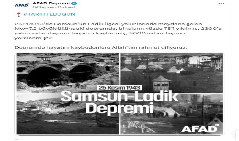 Samsun’un Ladik ilçesinde 26 Kasım 1943 tarihinde meydana gelen 7.2 büyüklüğündeki depremin yıldönümünde, AFAD bir anma paylaşımı yaptı.