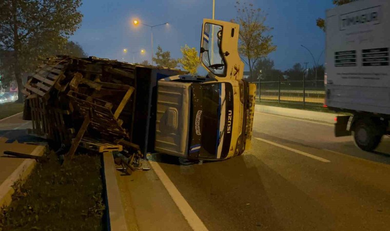 Bursa’nın İnegöl ilçesinde lastiği patlayan palet yüklü kamyonet devrildi, kazada şans eseri yaralanan olmadı.