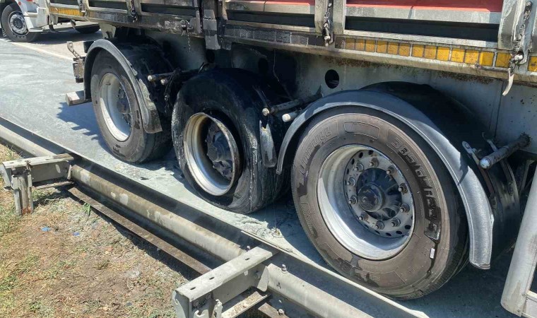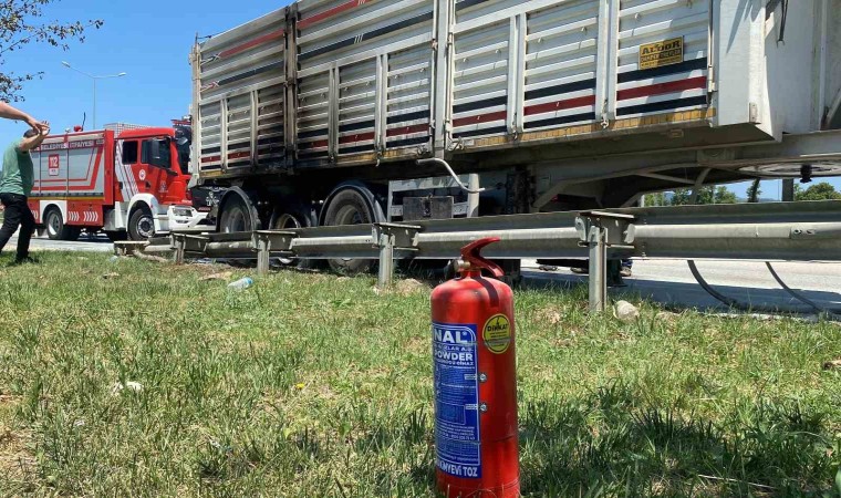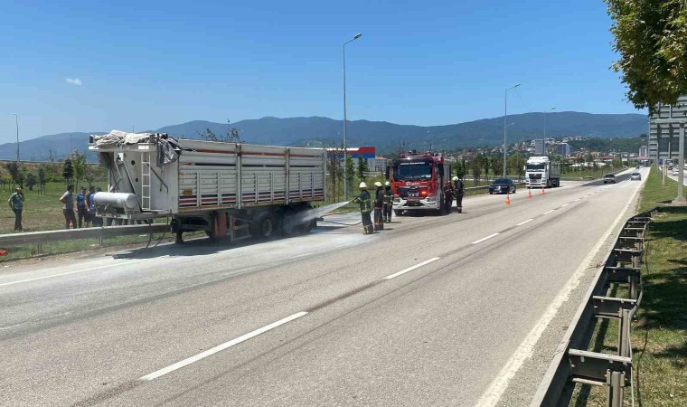 Düzce’de seyir halindeki tırın lastiğinin patlaması sebebiyle çıkan yangında dorsede hasar oluştu.