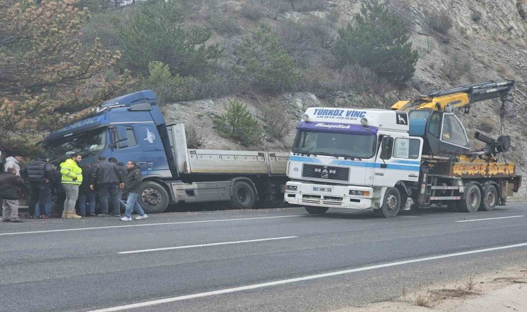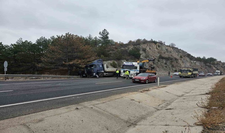 Ankara’da lastiğinin patlaması nedeniyle kontrolden çıkan tır bariyere çarparak durabildi.