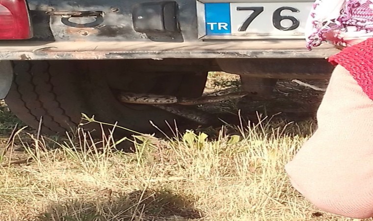 Iğdır merkeze bağlı Elmagöl köyünde ot taşıyan bir sürücü araba tekerleğin arasına sıkışmış 1 metre uzunluğundaki yılanı görünce neye uğradığını şaşırdı.