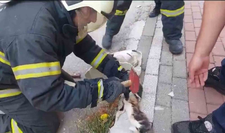 Kocaeli’nin İzmit ilçesinde sokağa bırakılan seramik lavaboya sıkışan yavru kedi, itfaiye ekipleri tarafından kurtarıldı.