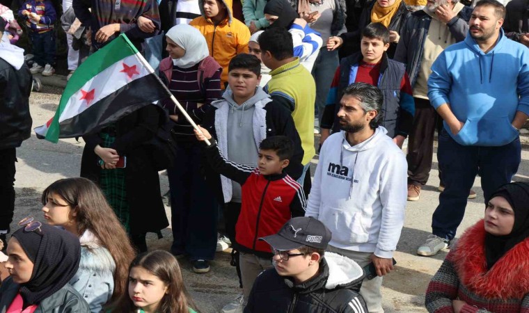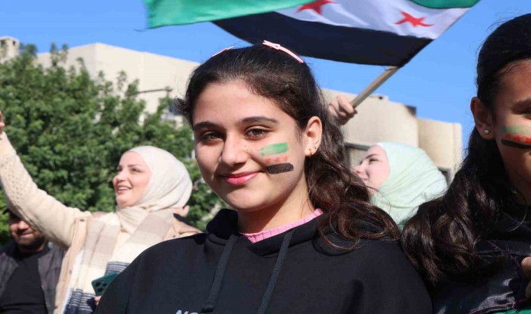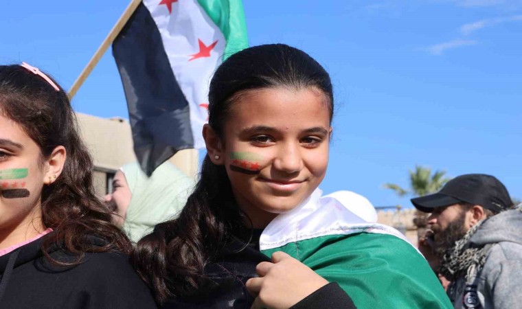Kutlamalara katılan çocukların yüzlerine boya ile yeni Suriye bayrağı çizildi.