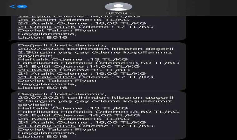 Sektörün uluslararası temsilcilerinden Lipton’da düşük fiyat kervanına katılınca çay üreticileri tepki gösterdi. Lipton üreticiden çayı Ocak ayında ödeme yapılması şartı ile 17 TL’den aldığını duyururken 24 Aralık’ta ödeme şartı ile 16 TL, 26 Kasım’da ödeme şartı ile 15 TL, 24 Eylül’de ödeme şartı ile 14 TL’den alacağını duyurdu. Çayını satarak parayı pesin almak isteyenler için ise kilogram fiyatının fabrikada haftalık ödeme şartı ile 13 Lira 50 Kuruş, haftalık ödeme şartı ile 13 TL olduğunu açıkladı.