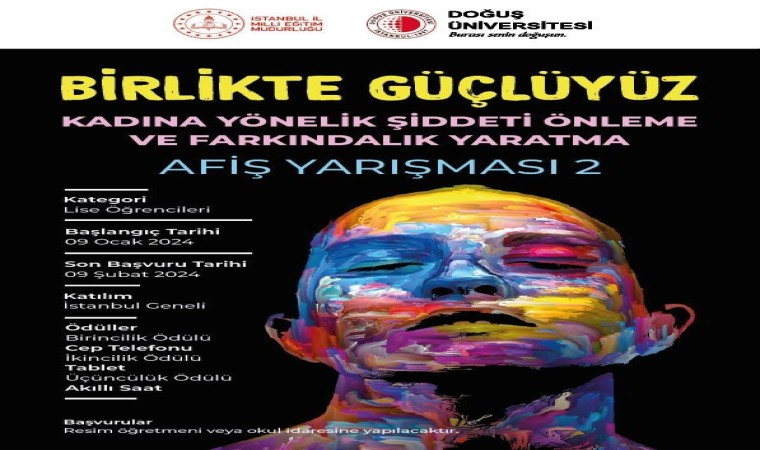 İstanbul İl Milli Eğitim Müdürlüğü, Doğuş Üniversitesi iş birliğiyle İstanbul genelindeki tüm lise öğrencilerinin katılımına açık afiş yarışması düzenleniyor. "Kadına Yönelik Şiddeti Önleme ve Farkındalık oluşturma" teması etrafında şekillenen yarışma, öğrencilere, sadece fiziksel değil, sözlü, duygusal, psikolojik, ekonomik şiddet gibi diğer şiddet türleri konusunda da bilinç kazandırmayı amaçlıyor. Ayrıca, şiddeti önleme çalışmalarına dikkat çekerek aile içi iletişimi güçlendirmeyi ve gençleri sosyal sorumluluk alanında teşvik etmeyi hedefliyor.