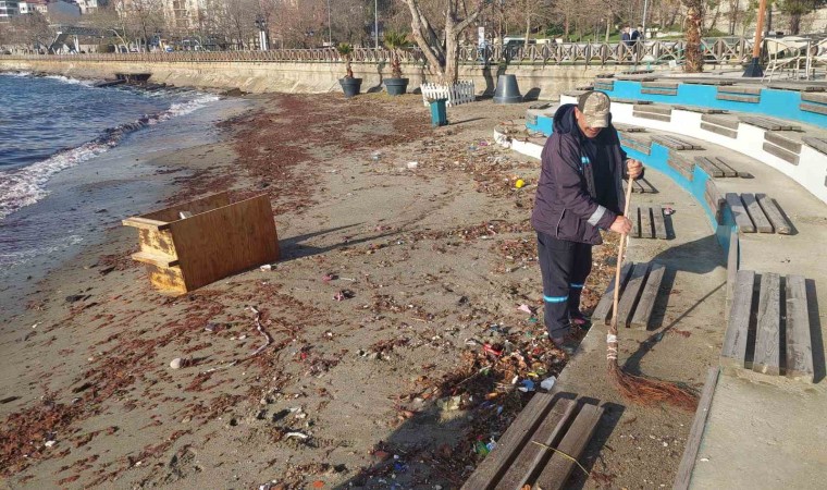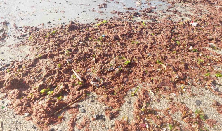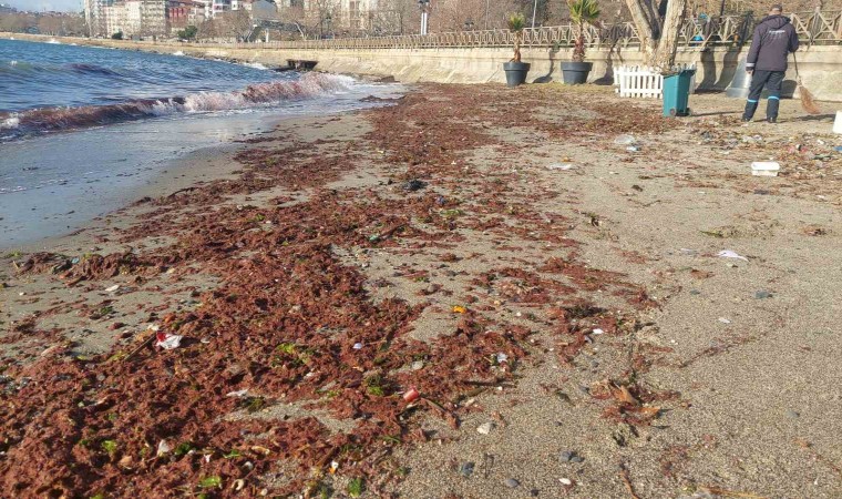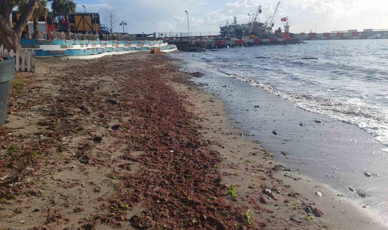 Meteoroloji Genel Müdürlüğü tarafından yapılan uyarının ardından Tekirdağ kıyılarında etkili olan lodos, kıyılara kızıl yosun getirdi.