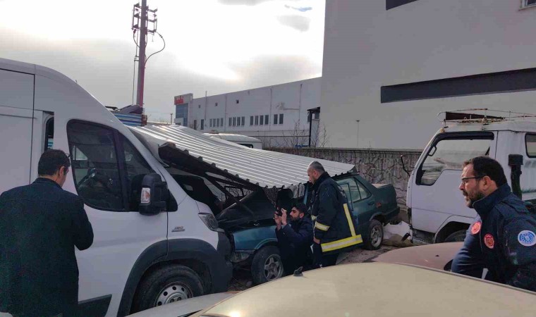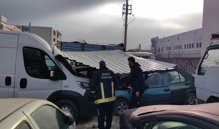 Bursa’da meydana gelen olayda lodosun uçurduğu fabrikanın çatısı, yediemin otoparkındaki ağaçlara zarar verdi.