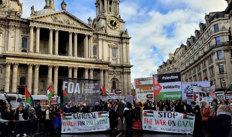 İsrail’in Gazze Şeridi’ne yönelik saldırıları 64’üncü günde devam ederken, İngiltere’nin başkenti Londra’da on binlerce kişi Filistin’e destek protestosu düzenledi. Başkentteki Banka Kavşağı’nda bir araya göstericiler, Parlamento Meydanı’na yürüdü. Ateşkes çağrısında bulunan göstericiler, ellerinde Filistin bayrakları taşıdı. Göstericiler, yürüyüş sırasında “Özgür Filistin”, “Ateşkes şimdi”, “Kuşatmayı kaldırın”, "Nehirden denize kadar Filistin özgür olacak” ve “İsrail bir terör devletidir” sloganları attı.