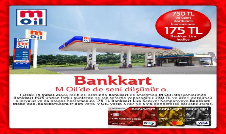 İSTANBUL,(DHA)- M Oil ve Ziraat Bankası, Bankkart kullanıcılarını kapsayan yeni bir kampanya duyurdu. Kampanya kapsamında Bankkart anlaşmalı M Oil istasyonlarında Bankkart POS’undan farklı günlerde ve tek seferde yapılacak 750 TL ve üzeri 4’üncü akaryakıt ya da otogaz alışverişine 175 TL Bankkart Lira hediye ediliyor.