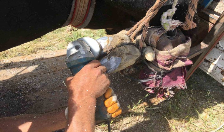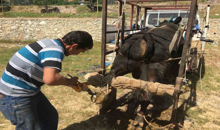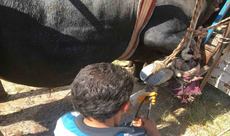 Aydın’da büyükbaş hayvanı olan vatandaşlar, merada otlanan hayvanlarının ayaklarına bir şey batmaması, et ve süt veriminin artması için düzenli olarak hayvanlarına tırnak bakımı yaptırıyor. Seyyar nalbantlık yapan Nusret Kalem, eskiyen tırnakları temizleyip yeni nal takıyor.