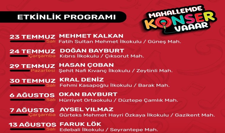 23 Temmuz 2024 Salı Günü Güneş Mahallesi Fatih Sultan Mehmet İlkokulu Mehmet Kalkan ile başlayacak konserler serisi, 24 Temmuz 2024 Çarşamba Günü Çıksorut Mahallesi’nde Kıbrıs İlkokulu’nda Şarkıcı Doğan Bayburt, 29 Temmuz 2024 Pazartesi Günü Zeytinli Mahallesi’nde Şehit Nafi Kıvanç İlkokulu’nda Hasan Çoban, 30 Temmuz 2024 Salı Günü Barak Mahallesi Fehmi Kasapoğlu İlkokulu’nda Kral Deniz, 6 Ağustos 2024 Salı Günü Düztepe Çamlık Mahallesi’nde Hürriyet Ortaokulu’nda Okan Bayburt, 7 Ağustos 2024 Çarşamba Günü Gazikent Mahallesi’nde Gürteks Mehmet Hayri Özkaya İlkokulu’nda Aysel Yılmaz ile devam edecek. Son gün olan 13 Ağustos 2024 Salı Günü Seyrantepe Mahallesi’nde Edebali İlkokulu’nda ise şarkıcı Faruk Lök sahne alacak.