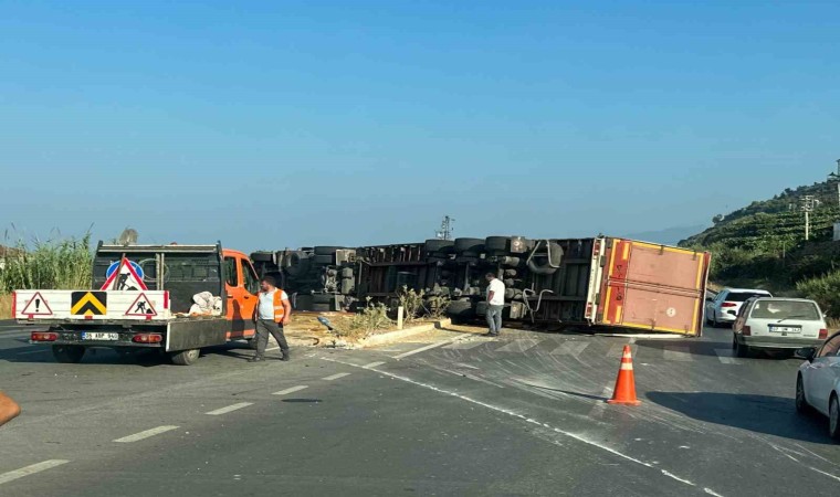 Antalya’nın Alanya ilçesinde sürücüsünün hakimiyetini kaybeden makarna yüklü tırın yan yattığı kazada 2 kişi yaralandı.
