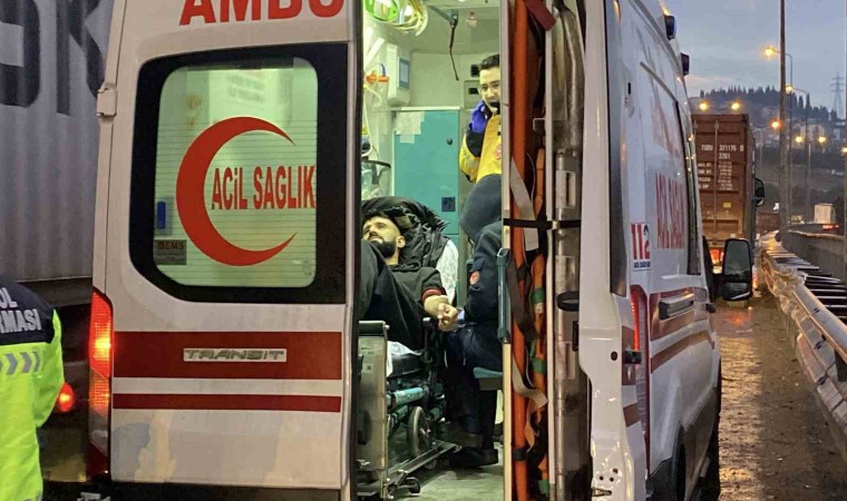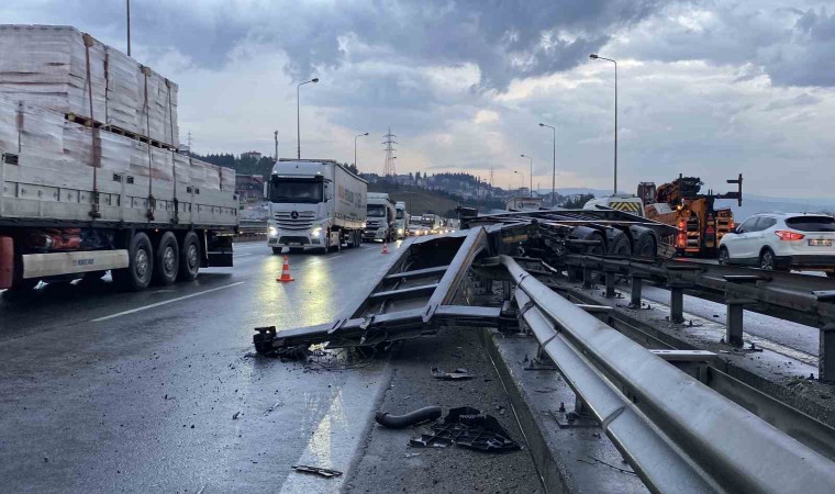 TEM Otoyolu Kocaeli geçişinde sürücüsünün direksiyon hakimiyetini kaybettiği tır makaslama yaptı. Tırdan ayrılan konteyner yola düşerken, dorsesi ise bariyerleri aşarak 2 şeridi de kapadı. 2 araç daha kazaya karışırken, tır sürücüsü yaralandı.