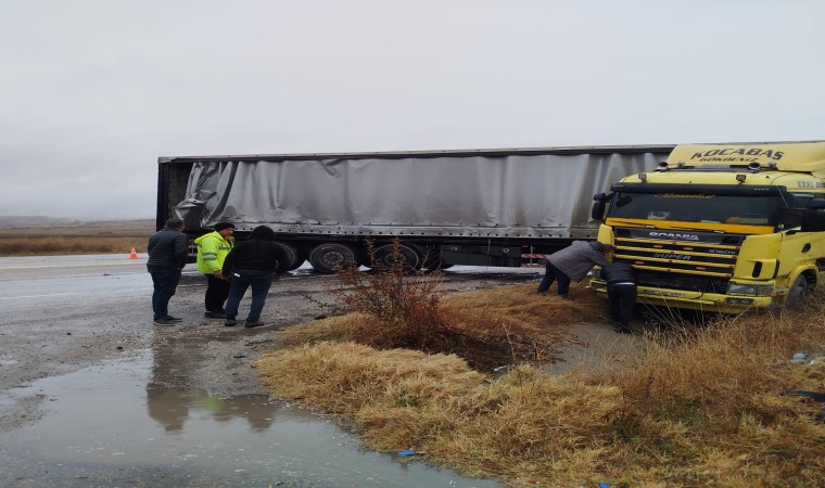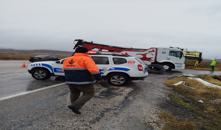 Çorum’un Alaca ilçesinde sürücüsünün direksiyon hakimiyetini kaybettiği tır makasladı. Kazada sürücü yara almadan kurtuldu.
