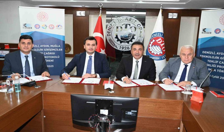 İleri Girişimci Destek Programı İş Fikri Teklif Çağrısı çerçevesindeki Gıda İle Makine İmalatı Sektörlerinin Gelişmesine Yönelik Teknolojik Girişimciler Teklif Çağrısına Dair İş Birliği Protokolü KOSGEB Girişimcilik Dairesi Başkanı Ali Urhan, Denizli Ticaret Odası (DTO) Başkanı Uğur Erdoğan, Aydın Sanayi Odası (AYSO) Başkanı Gökhan Maraş, Muğla Ticaret ve Sanayi Odası (MUTSO) Başkanı Bülent Karakuş, KOSGEB Aydın Müdürü ve Muğla Müdür Vekili Sadullah Dülger, KOSGEB Denizli Müdürü Dr. Aziz Acar, Denizli Avrupa Birliği İş Geliştirme Merkezi (ABİGEM) Yetkilisi Enis Erdal, AYSO Genel Sekreteri Kerem Öden, DTO Genel Sekreteri Ali Rıza Tekin ve Genel Sekreter Yardımcısı Dr. Akay Gündoğan, DTO Başkanlık Özel Kalem ve Basın Sorumlusu Ömer Altıntaş, DTO İletişim ve Organizasyon Sorumlusu Ozan Öner Özmen, KOSGEB Girişimcilik Destekleri Müdürü Onur Ege ve KOBİ Uzman Yardımcısı Ender Ayvacı’nın katılımıyla, Denizli Ticaret Odası’nın hizmet binasındaki toplantı salonunda imzalandı.