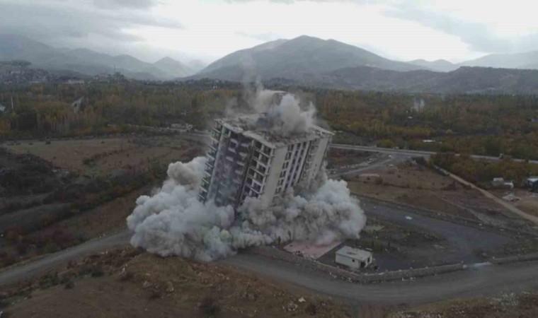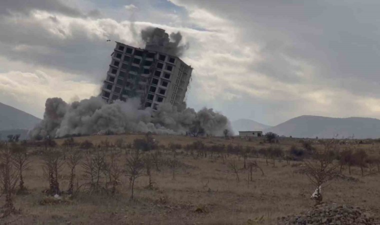 Asrın felaketinden etkilenen illerin başında gelen Malatya’da ağır hasarlı 16 katlı bina, 120 kilogram dinamit kullanılarak patlatma yöntemiyle yıkıldı.