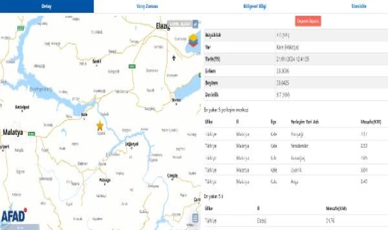 Afet ve Acil Durum Yönetim (AFAD) Başkanlığı verilerine göre, saat 15.41'de merkez üssü Malatya'nın Kale ilçesinde Richter ölçeğine göre 4.0 büyüklüğünde deprem yaşandı. 9,7 kilometre derinlikte kaydedilen çevre il ve ilçelerde de hissedilen depremde ilk belirlemelere göre, herhangi bir olumsuzluk yaşanmadı. (DHA)