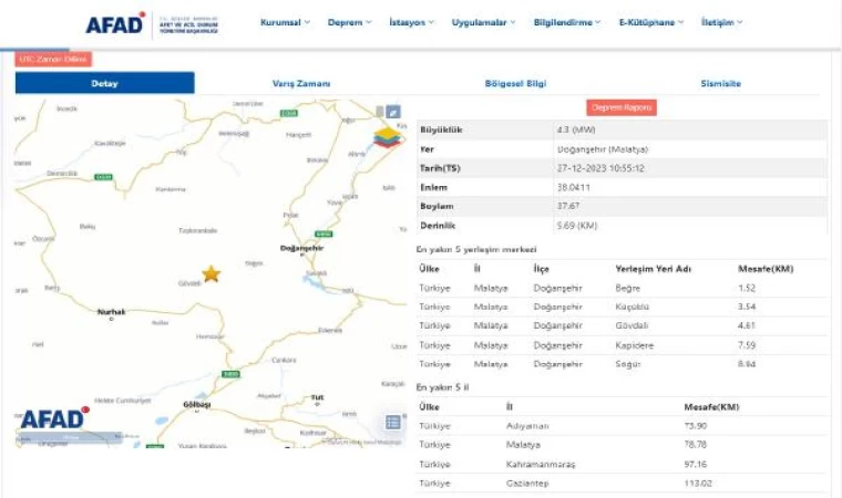 Mahir ALAN/MALATYA, (DHA)-MALATYA'nın Doğanşehir ilçesinde Richter ölçeğine göre 4.3 büyüklüğünde deprem meydana geldi.