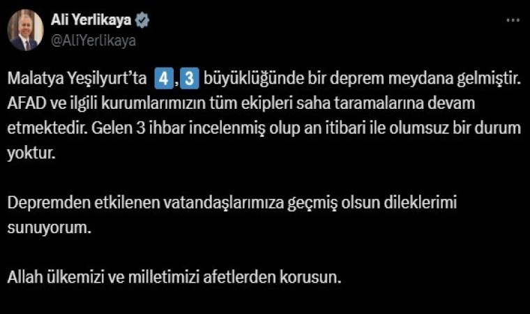 Öte yandan depremle ilgili sosyal medya hesabından açıklama yapan İçişleri Bakanı Ali Yerlikaya, "Malatya Yeşilyurt’ta 4.3 büyüklüğünde bir deprem meydana gelmiştir. AFAD ve ilgili kurumlarımızın tüm ekipleri saha taramalarına devam etmektedir. Gelen 3 ihbar incelenmiş olup an itibari ile olumsuz bir durum yoktur. Depremden etkilenen vatandaşlarımıza geçmiş olsun dileklerimi sunuyorum. Allah ülkemizi ve milletimizi afetlerden korusun.