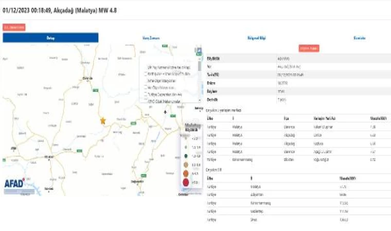 Afet ve Acil Durum Yönetimi Başkanlığı'ndan (AFAD) alınan bilgiye göre; saat 03.18'de merkez üssü Akçadağ ilçesi olan 4.8 büyüklüğünde deprem meydana geldi. Yerin 7 kilometre derinliğinde kaydedilen deprem, kısa süreli endişe yarattı. İlk belirlemelere göre; depremde herhangi bir olumsuzluk yaşanmadı. (DHA)