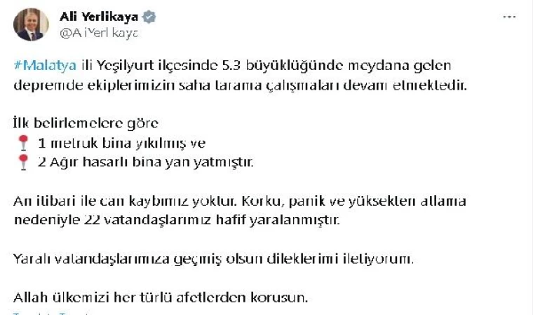 İçişleri Bakanı Ali Yerlikaya, Malatya'nın Yeşilyurt ilçesinde meydana gelen 5.3 büyüklüğündeki depreme ilişkin Twitter hesabından yaptığı paylaşımda, "Malatya ili Yeşilyurt ilçesinde 5.3 büyüklüğünde meydana gelen depremde ekiplerimizin saha tarama çalışmaları devam etmektedir. İlk belirlemelere göre 1 metruk bina yıkılmış ve 2 Ağır hasarlı bina yan yatmıştır. An itibari ile can kaybımız yoktur. Korku, panik ve yüksekten atlama nedeniyle 22 vatandaşlarımız hafif yaralanmıştır. Yaralı vatandaşlarımıza geçmiş olsun dileklerimi iletiyorum. Allah ülkemizi her türlü afetlerden korusun" dedi. (DHA)
