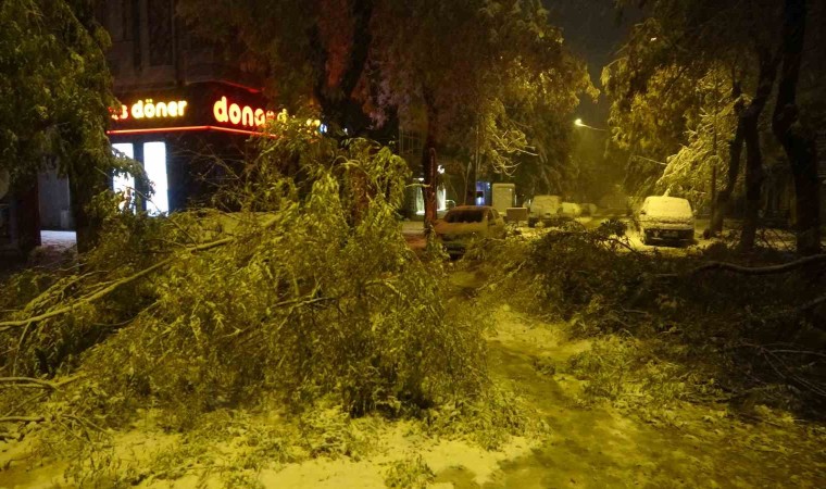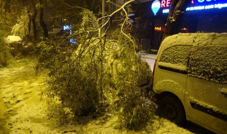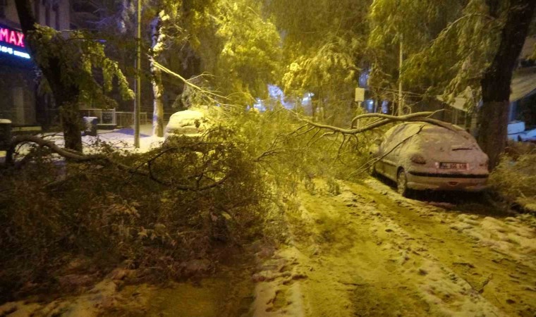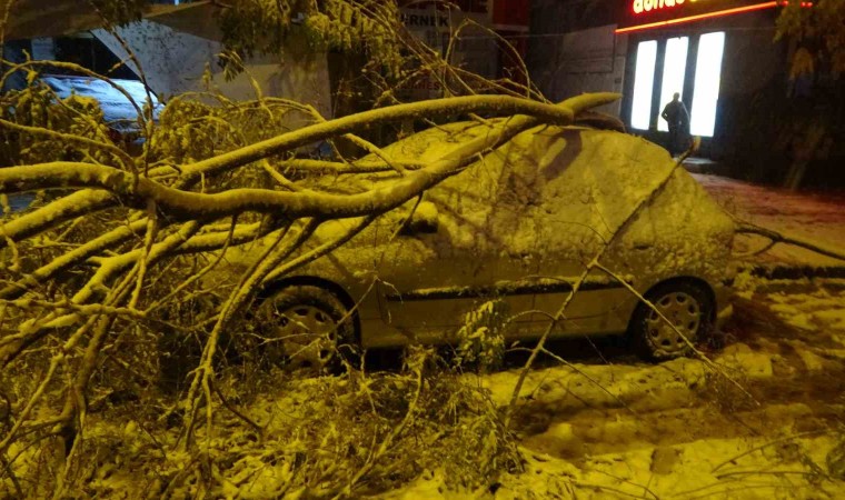 Aralıksız devam eden karın ağırlığına dayanamayan bazı ağaçlar ile kırılan dallar araçların üzerine devrildi.