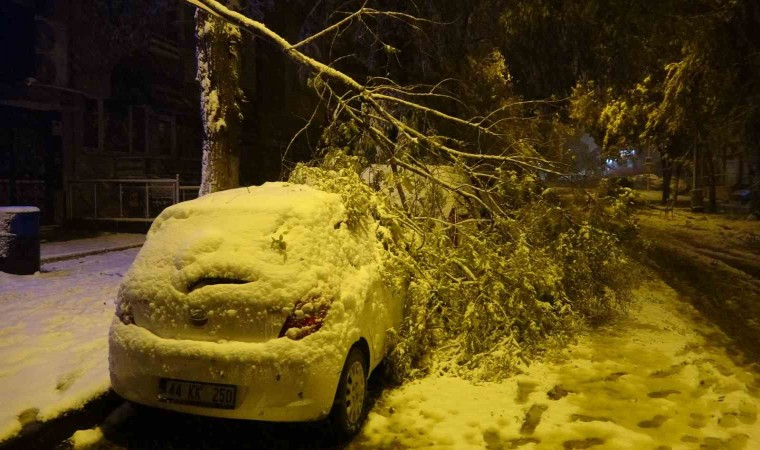 Yoğun kar yağışının devam ettiği Malatya’da, birçok noktada yağışlara dayanamayan ağaçlar park halindeki araçların üzerine devrildi.