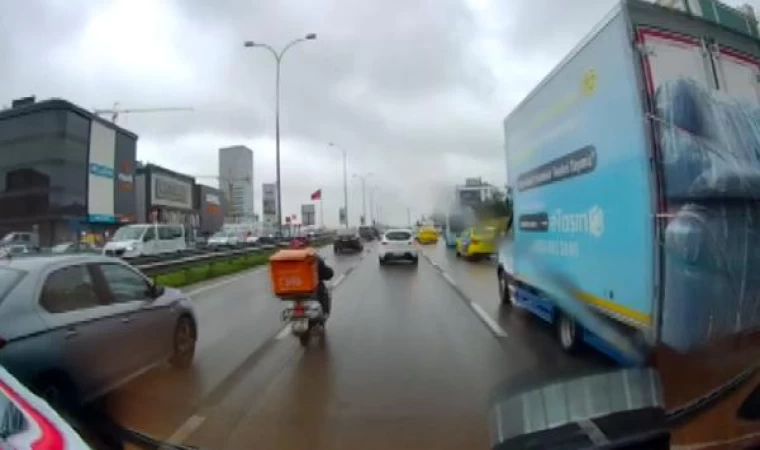 Murat SOLAK / İSTANBUL, (DHA)- MALTEPE, D-100 Karayolu’nda orta şeritte ilerleyen motokurye, yağıştan dolayı kayganlaşan zeminde hâkimiyetini kaybederek düştü. Motokurye, arkadan gelen otomobilin altında kalmaktan son anda kurtuldu. Kaza anı, araç kamerasına yansıdı.
