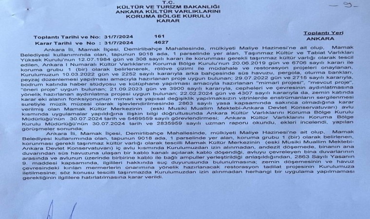 "Ankara İli, Mamak İlçesi, Demirlibahçe Mahallesinde, mülkiyeti Maliye Hazinesi’ne ait olup, Mamak Belediyesi kullanımında olan, tapunun 9018 ada, 1 parselinde yer alan, koruma grubu 1 (bir) olarak belirlenen, korunması gerekli taşınmaz kültür varlığı olarak tescilli Mamak Kültür Merkezinin (eski Musiki Muallim Mektebi- Ankara Devlet Konservatuvarı) iç avlu kısmında Kurulumuzdan izin alınmadan, andezit döşemede, binanın ana duvarından süs havuzuna ulaşan bir kablo kanalı açılarak kablo döşendiği, avluyu çevreleyen bina duvarlarının arasında ve avlunun üzerinde birbirine kablo ile bağlı ampuller yerleştirildiği anlaşıldığından, 2863 Sayılı Yasanın 9. maddesi kapsamında, ilgilileri hakkında suç duyurusunda bulunulmasına; zemin döşemesinin ve havuz çevresindeki kırılan mermerlerin onarımına yönelik hazırlanacak restorasyon tadilat projesinin Kurulumuza iletilmesine; söz konusu tescilli taşınmazda Kurulumuzdan izin alınmadan herhangi bir uygulama yapılmaması gerektiğinin ilgililere hatırlatılmasına karar verildi.’’