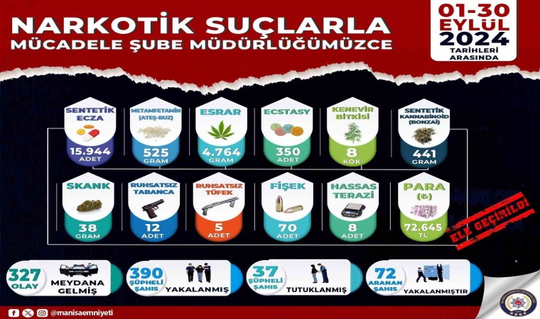 Manisa İl Emniyet Müdürlüğü Narkotik Suçlarla Mücadele Şube Müdürlüğünün; Akhisar, Alaşehir, Salihli, Soma ve Turgutlu Narkotik Suçlarla Mücadele Büro Amirlikleri ile birlikte il genelinde uyuşturucu madde ticareti yapan, aracılık eden, nakleden ve bulunduran şahısların deşifresine yönelik 01-30 Ekim tarihleri arasında yürütülen çalışmalarda yüklü miktarlarda uyuşturucu madde ele geçirildi. Gerçekleştirilen operasyon ve uygulamalarda; 390 şüpheli şahıs yakalanırken, 37 şüpheli ise tutuklandı. Aranma kaydı bulunan 72 şüpheli de yakalandı. Yine yapılan operasyonlar kapsamında; 15 bin 944 sentetik hap, 525 gram metamfetamin maddesi, 350 adet ecstasy hap, 4 bin 764 gram esrar maddesi, 38 gram skank maddesi, 441 gram Bonzai maddesi, 8 kök Hint kenevir bitkisi, 12 adet ruhsatsız tabanca, 70 adet fişek, 8 adet hassas terazi ve uyuşturucu madde ticaretinden elde edildiği değerlendirilen 72 bin 645 TL para ele geçirildi.