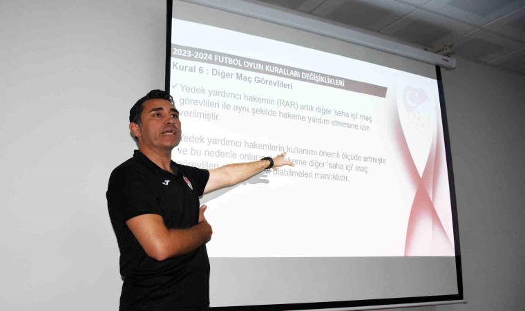 FIFA VAR hakemi ve TFF hakem eğitimcisi Koray Gençerler, yeni sezon öncesi Trendyol 1. Lig ekiplerinden Manisa FK takımına değişen futbol oyun kuralları ile ilgili eğitim verdi.
