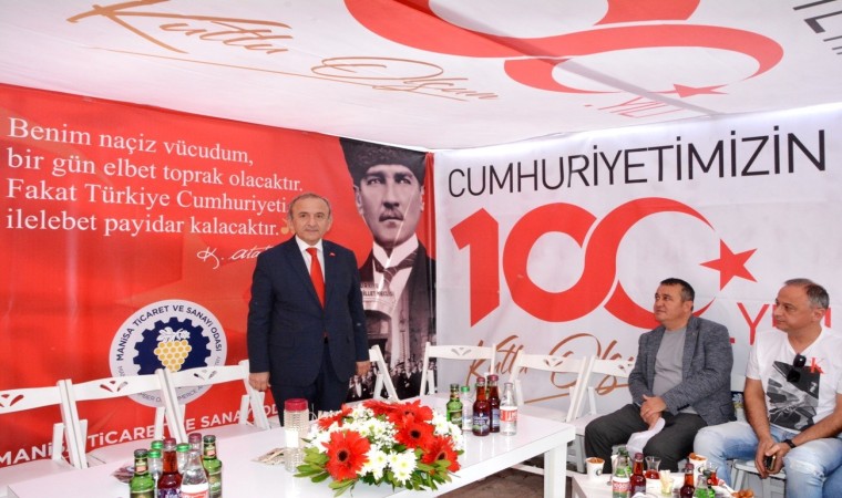Manisa Ticaret ve Sanayi Odası (MTSO) Türkiye Cumhuriyet’inin 100. yılını dolayısıyla 15 Temmuz Demokrasi Meydanı’nı afişlerle donattı, stant açtı. Öte yandan Manisa Valiliği önünde düzenlenen kutlama töreninde vatandaşlara Türk bayrağı, balon ve şapka dağıttı.