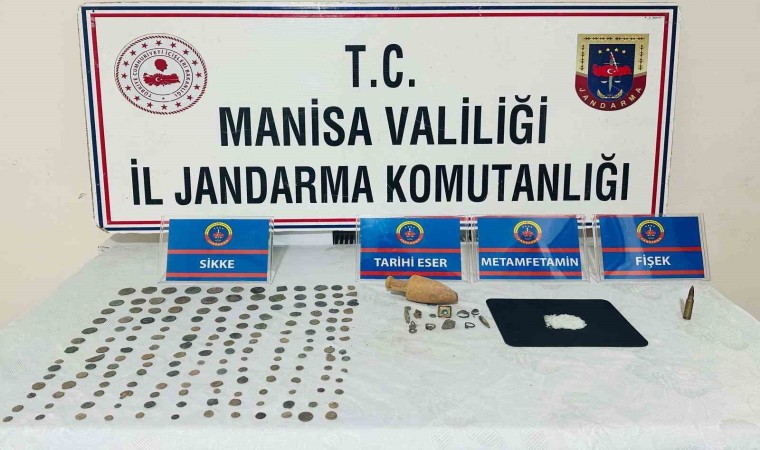 Kültür ve Tabiat Varlıklarının Korunması ile kaçakçılığın önlenmesi, uyuşturucu veya uyarıcı madde ticareti yapan, nakleden ve kullanan şahıslara yönelik çalışmalarını sürdüren Salihli İlçe Jandarma Komutanlığına bağlı ekipler, M.Ç.’nin (26) ikametinde uyuşturucu bulundurduğu bilgisine ulaştı. Harekete geçen ekipler, operasyon düzenleyip, şüphelinin ikamet ve eklentilerinde arama yaptı. Yapılan aramada 168 adet tarihi eser niteliği taşıyan sikke, 12 adet tarihi obje, 6.4 gram metamfetamin ve 1 adet 7.62 çapında fişek ele geçirildi.