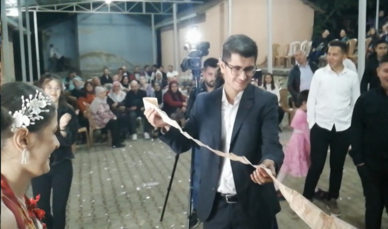 Manisa’nın Salihli ilçesinde gerçekleşen düğünde geline kardeşi tarafından 50 TL’lik banknotları birbirine ekleyerek hazırladıkları 8 metre uzunluğunda “para zinciri” taktı.