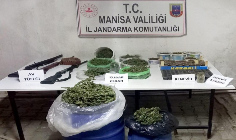 Manisa İl Jandarma Komutanlığı İstihbarat ve KOM Şube Müdürlükleri ile Sarıgöl ilçe Jandarma Komutanlığı ekipleri tarafından uyuşturucu operasyonu düzenlendi. .Ç. (57) ve S.Z. (47) isimli şahısların evlerine düzenlenen baskında 16 bin 250 kilogram kubar esrar, 295 adet fide halinde kenevir bitkisi, 325 gram kenevir tohumu, 3 adet ruhsatsız av tüfeği ele geçirildi.