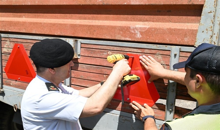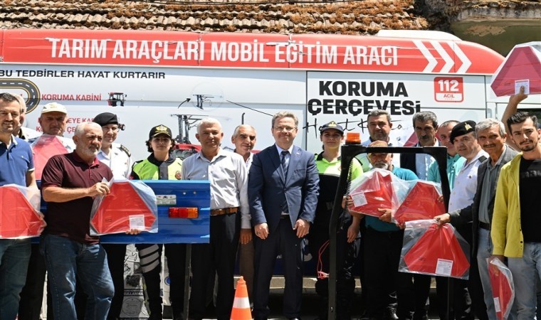 “Reflektör Tak Görünür Ol” projesi kapsamında traktörlerin karıştığı trafik kazalarının önlenmesi, azaltılması ve traktörlerin özellikle gece şartlarında görünürlüğünün artırılması amacıyla gerçekleştirilen eğitim sonrası traktör sürücülerine 100 adet üçgen reflektör dağıtılarak trafik kurallarına uymaları gerektiği bir kez daha hatırlatıldı.