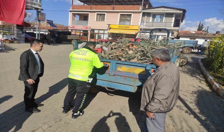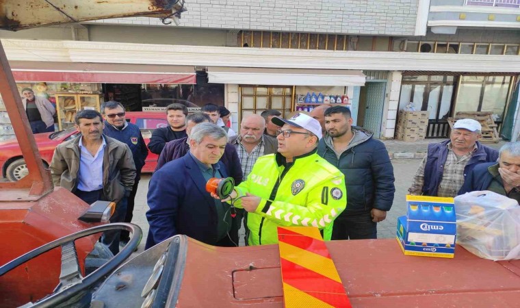 Polis ekipleri, traktör kazalarını önlemek amacıyla çiftçileri bilgilendirirken, traktör römorklarına takılan reflektörlerin önemine vurgu yaptı.