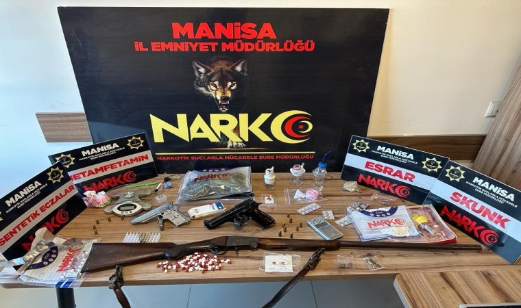 Manisa İl Emniyet Narkotik Suçlarla Mücadele Şube Müdürlüğü ekipleri tarafından il merkezi ve ilçelerinde uyuşturucu tacirlerine yönelik operasyon düzenlendi. 15 şahsa ait 18 adres ve 1 araca eş zamanlı düzenlenen şafak operasyonunda 143 adet sentetik ecza hap, 6 parça halinde 74.12 gram esrar maddesi, 6 parça halinde 32,13 gram metamfetamin maddesi, 4 kök Hint keneviri bitkisi, 2 parça halinde 1,59 gram skunk, 2 adet hassas terazi, 2 adet tabanca ve 32 adet fişek, 1 adet ruhsatsız tüfek ve 1 adet sustalı bıçak, 6 adet madde içme aparatı ve 1 adet uyuşturucu madde sarımında kullanılan alüminyum folya, 400 adet doldurulmuş makaron, 6 bin 600 adet boş makaron, 17 kilo 300 gram tütün, 1 adet sigara basma makinesi ve 1 adet kompresör makinesi ele geçirildi.
